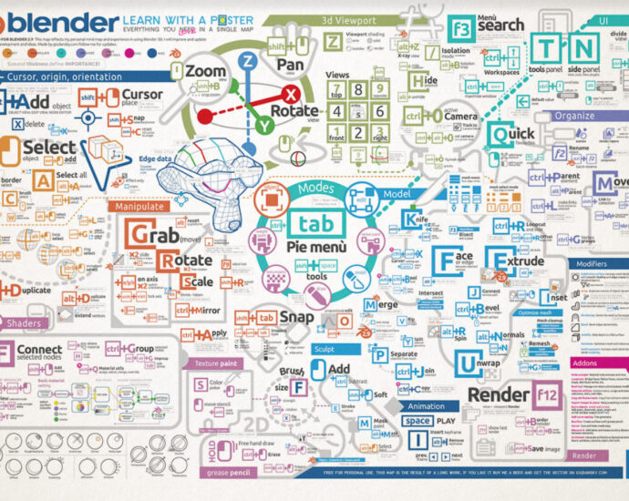 Esta infografía con los atajos de teclado y funciones de blender es de lo mejor que puedes encontrar para ayudarte a trabajar con Blender. Creada y actualizada por Giuliano DANSKY D’Angelo en giudansky.com, podéisVer